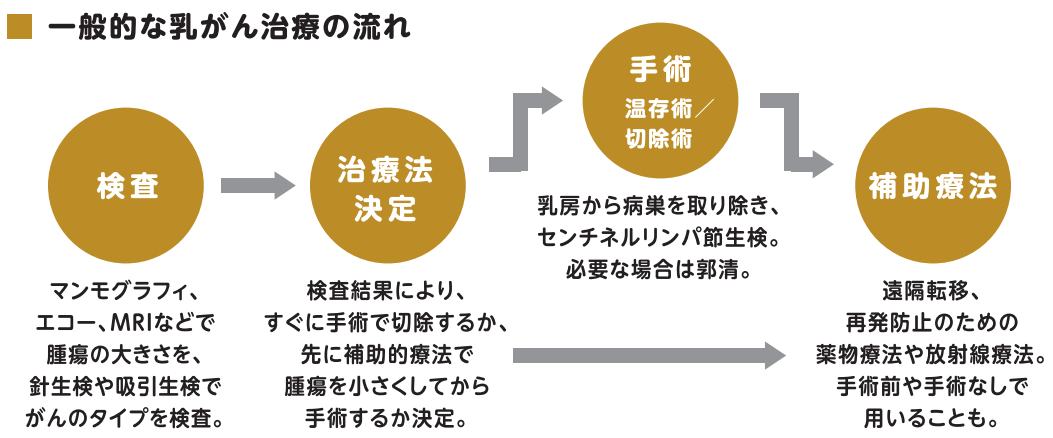 乳がんの治療は、手術、放射線治療、薬物療法(ホルモン療法、分子標的治療薬、化学療法など)を組み合わせて行う複合療法です。進行具合とがんの性格の違いを考慮して治療方法を組み立てます。