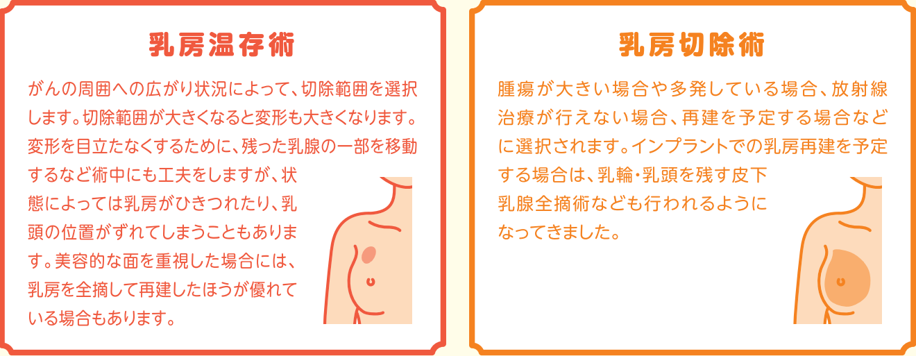 がんが部分切除で取り切れるかどうか、放射線治療が可能かどうか、どの程度の変形が予想されるか、そしてあなた自身とご家族の希望を踏まえ、乳房再建も含めて総合的に考慮して決めることになります。