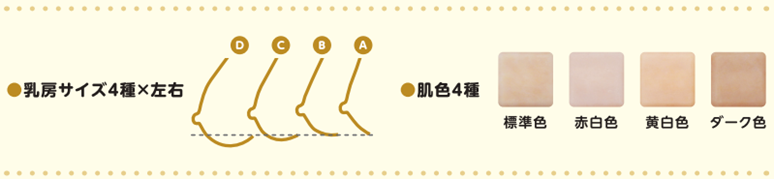 4種類の乳房サイズ、4種類の肌色が用意されており、ご自分にあった組み合わせを選ぶことができます。製作期間は約30~60日、費用は 15~ 20万円と抑えられています。
